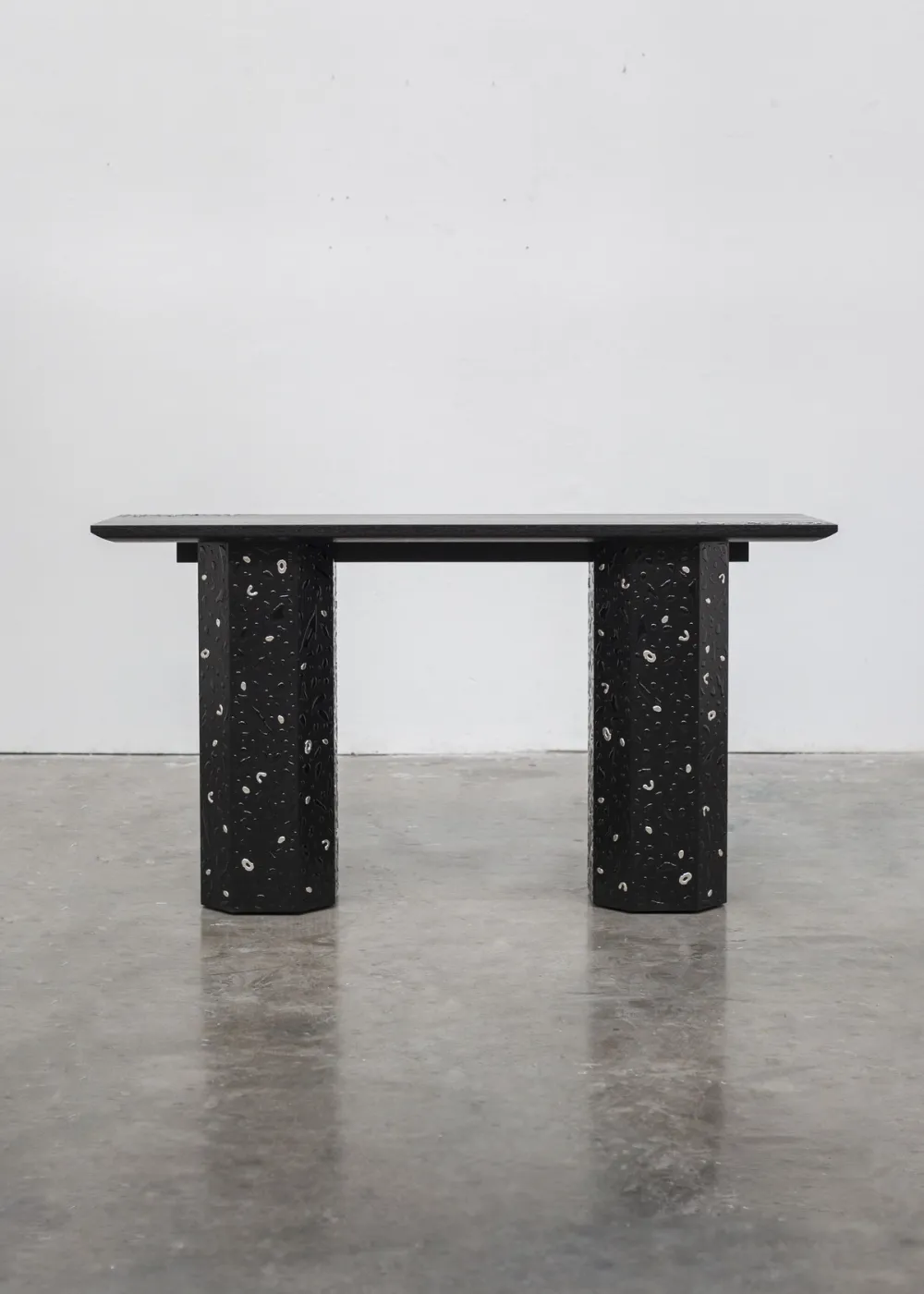 Quentin Vuong's first solo exhibition took place in January 2025 at Galerie Yves Gastou in Paris. He presented his furniture collection, After the Rain. In it, rain enters the living room, freezing the ephemeral onto the furniture. The black and silver resin drops are carefully poured onto matte wood, mimicking the delicacy of water at rest after a storm. Vuong’s mirrors possess a liquid and imperfect quality. Gilded with white gold leaf, they are adorned with cracks, artefacts of the human gesture. They reveal misty and ethereal images, expressing the passage of time. The collection invites us to engage in daily, light-filled, tactile contemplation of nature within our interiors.